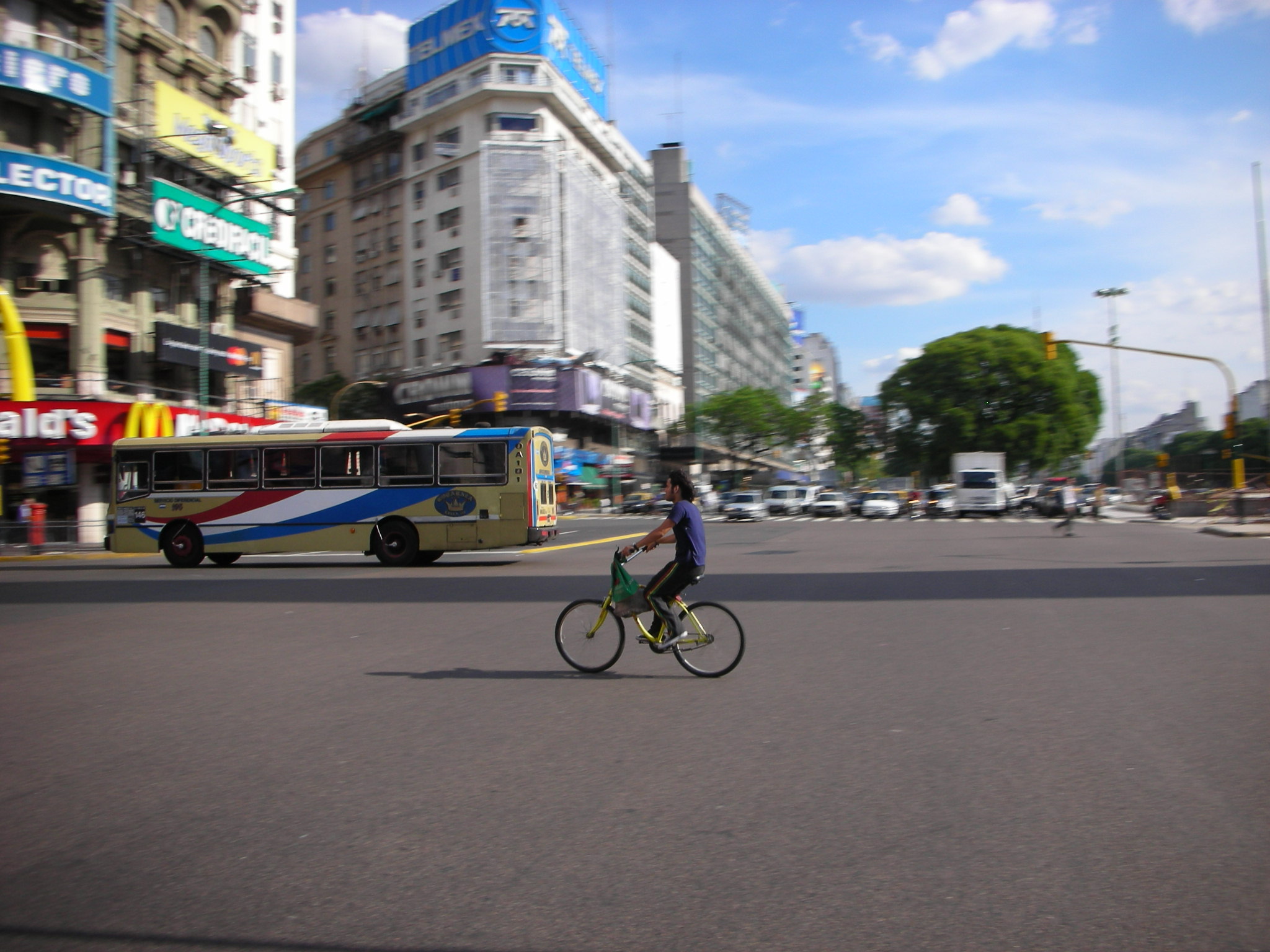 Avenida 9 de Julio is the widest avenue in the world. It is famous for the Washington Monument-like structure called Obelisco (just outside the view of this photo). On December 1, 2005, a giant condom was placed on the monument to commemorate World Aids Day: