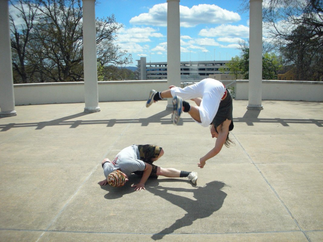 Photo displayed depicts two University of Arkansas students (Unknown, left; John Miller, right) practicing capoeira. This Afro-Brazilian martial art form combines spins, kicks, dance, and music. Musical instruments used in capoeira are typically rooted in Africa as well.